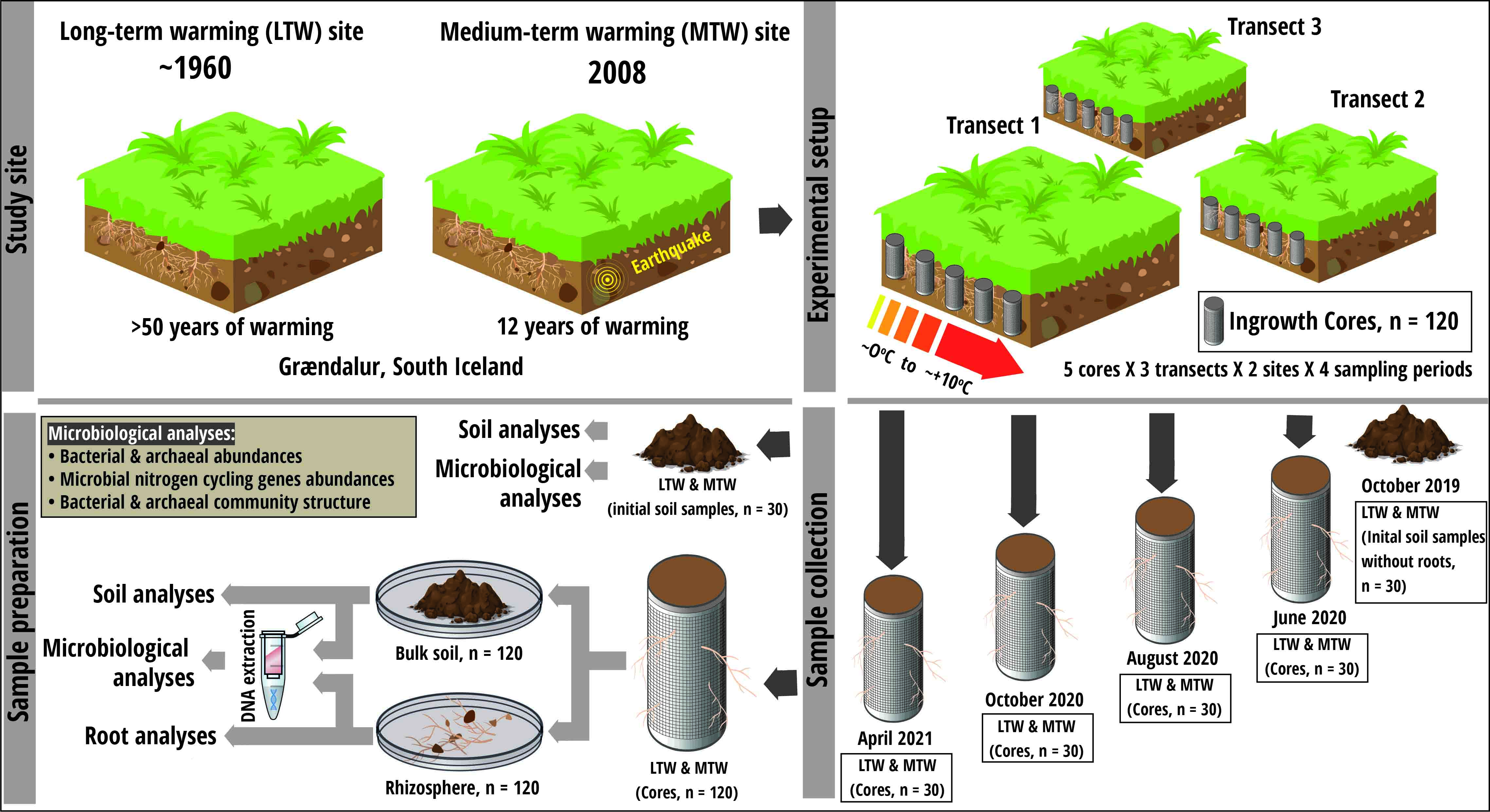 Geothermally warmed areas in Iceland provide natural temperature gradients, making them ideal for studying the impacts of soil warming. To explore these effects, root ingrowth cores were strategically placed along these temperature gradients at two grassland sites experiencing warming over 11-13 years (MTW) and over 60 years (LTW), with three replicate transects for each site (Fig.1). Soil temperatures were continuously recorded, and core samples were collected four times from 2019 to 2021.