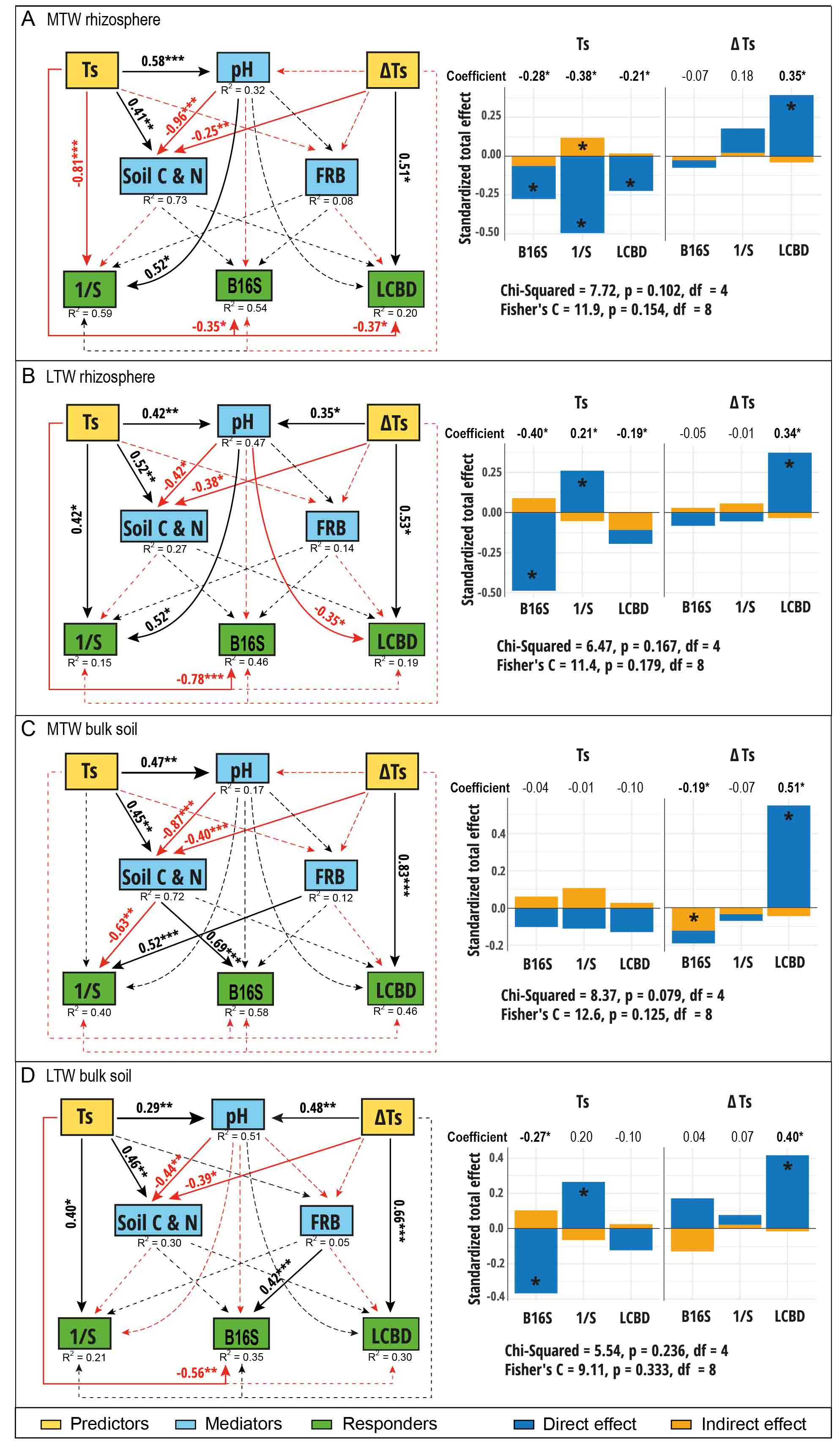 - Structural equation modeling indicated that warming had a more direct effect on the bacterial community than indirect effects mediated through soil and roots (Fig.2).